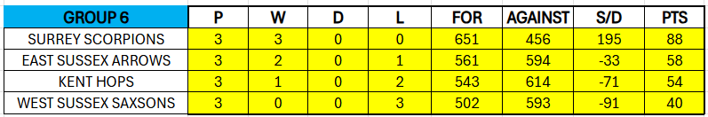 01/11/25 – (H) East Sussex Arrows 31 (221) – (153) 9 West Sussex Saxons – Results